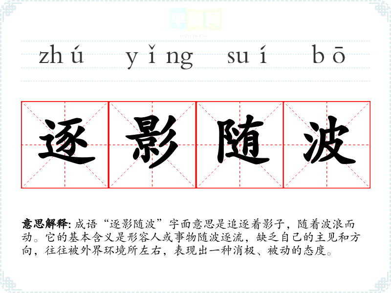 成语“逐影随波”字面意思是追逐着影子,随着波浪而动。它的基本含义是形容人或事物随波逐流,缺乏自己的主见和方向,往往被外界环境所左右,表现出一种消极、被动的态度。