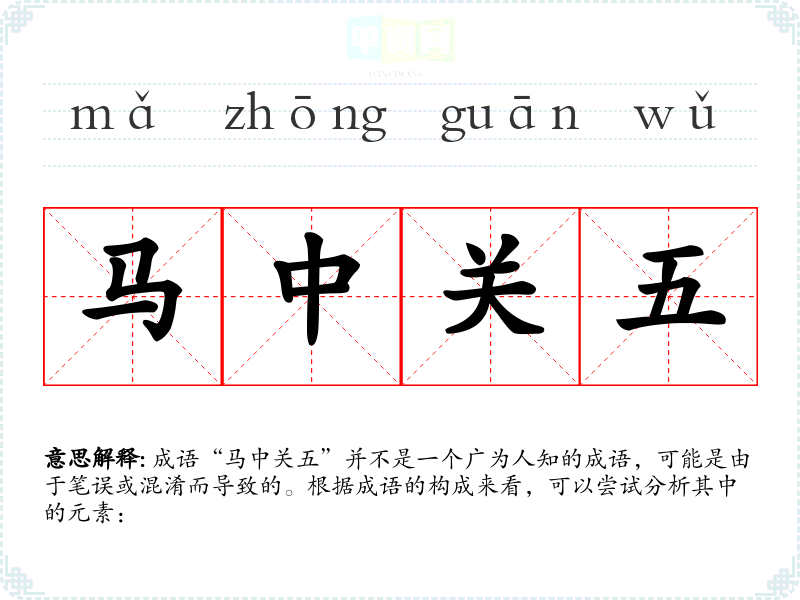 成语“马中关五”并不是一个广为人知的成语,可能是由于笔误或混淆而导致的。根据成语的构成来看,可以尝试分析其中的元素: