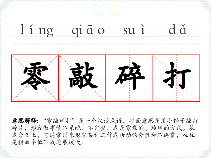 “零敲碎打”是一个汉语成语,字面意思是用小锤子敲打碎片,形容做事情不系统、不完整,或是零散的、琐碎的方式。基本含义上,它通常用来形容某种工作或活动的分散和不连贯,往往是指效率低下或进展缓慢。