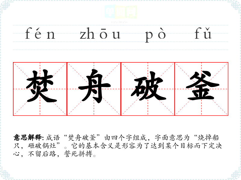 成语“焚舟破釜”由四个字组成,字面意思为“烧掉船只,砸破锅灶”。它的基本含义是形容为了达到某个目标而下定决心,不留后路,誓死拼搏。