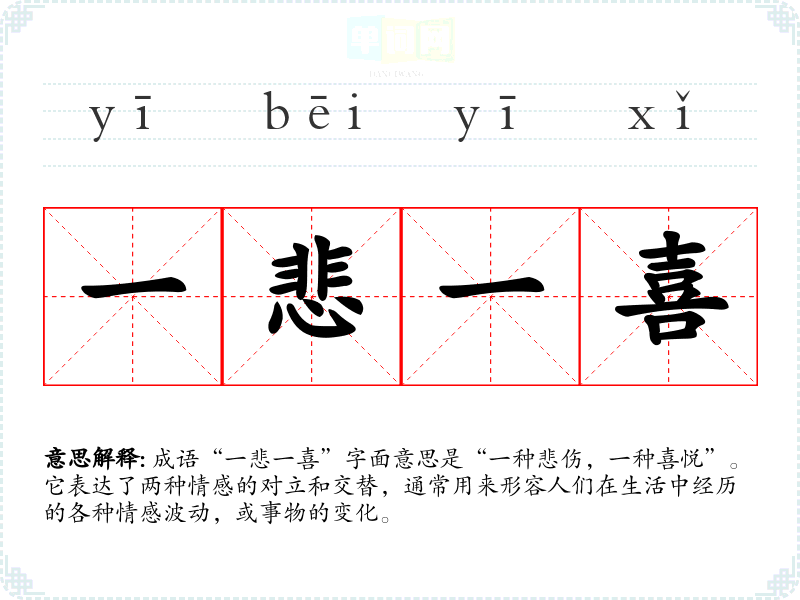 成语“一悲一喜”字面意思是“一种悲伤,一种喜悦”。它表达了两种情感的对立和交替,通常用来形容人们在生活中经历的各种情感波动,或事物的变化。