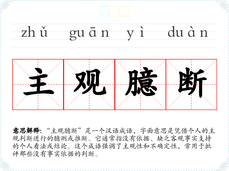 “主观臆断”是一个汉语成语,字面意思是凭借个人的主观判断进行的臆测或推断。它通常指没有依据、缺乏客观事实支持的个人看法或结论。这个成语强调了主观性和不确定性,常用于批评那些没有事实依据的判断。