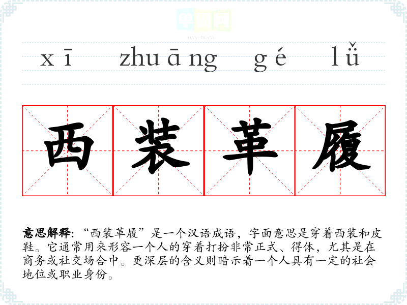 “西装革履”是一个汉语成语,字面意思是穿着西装和皮鞋。它通常用来形容一个人的穿着打扮非常正式、得体,尤其是在商务或社交场合中。更深层的含义则暗示着一个人具有一定的社会地位或职业身份。