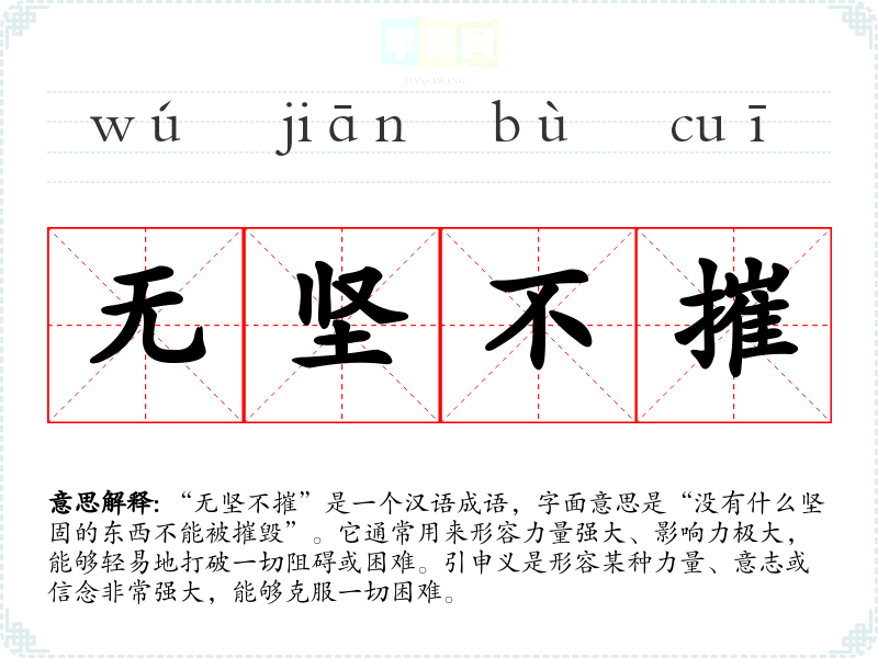 “无坚不摧”是一个汉语成语,字面意思是“没有什么坚固的东西不能被摧毁”。它通常用来形容力量强大、影响力极大,能够轻易地打破一切阻碍或困难。引申义是形容某种力量、意志或信念非常强大,能够克服一切困难。