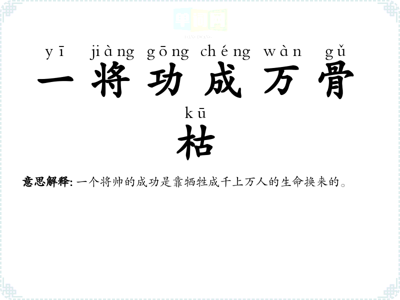 | 一将成功万骨枯 | 指一个将帅功成名就要以上万人的死亡为代价 |