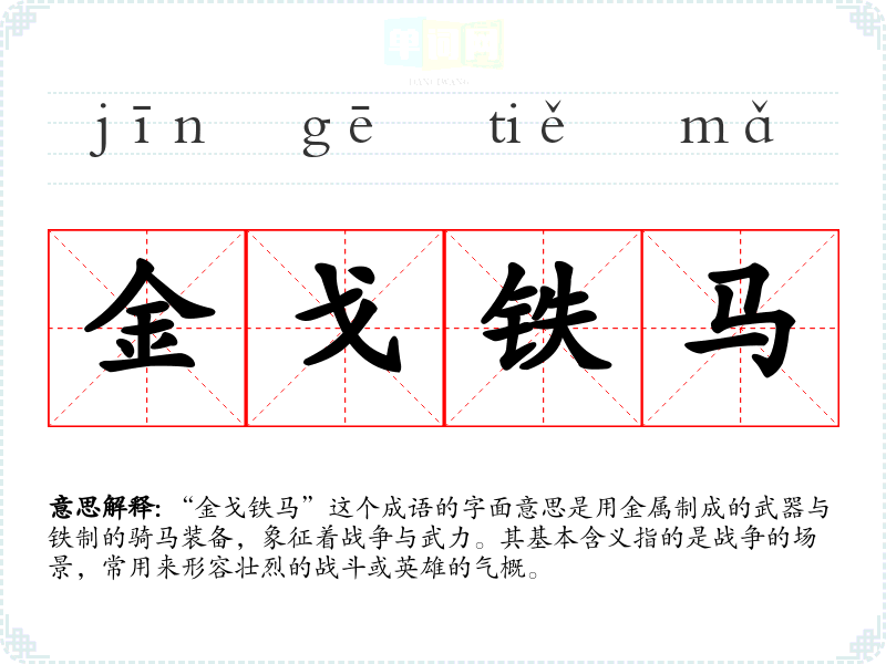 “金戈铁马”这个成语的字面意思是用金属制成的武器与铁制的骑马装备,象征着战争与武力。其基本含义指的是战争的场景,常用来形容壮烈的战斗或英雄的气概。