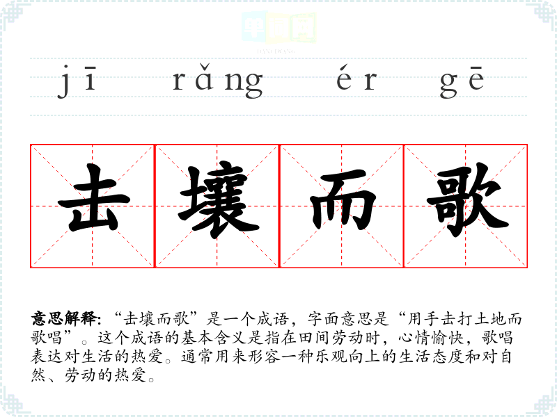 “击壤而歌”是一个成语,字面意思是“用手击打土地而歌唱”。这个成语的基本含义是指在田间劳动时,心情愉快,歌唱表达对生活的热爱。通常用来形容一种乐观向上的生活态度和对自然、劳动的热爱。