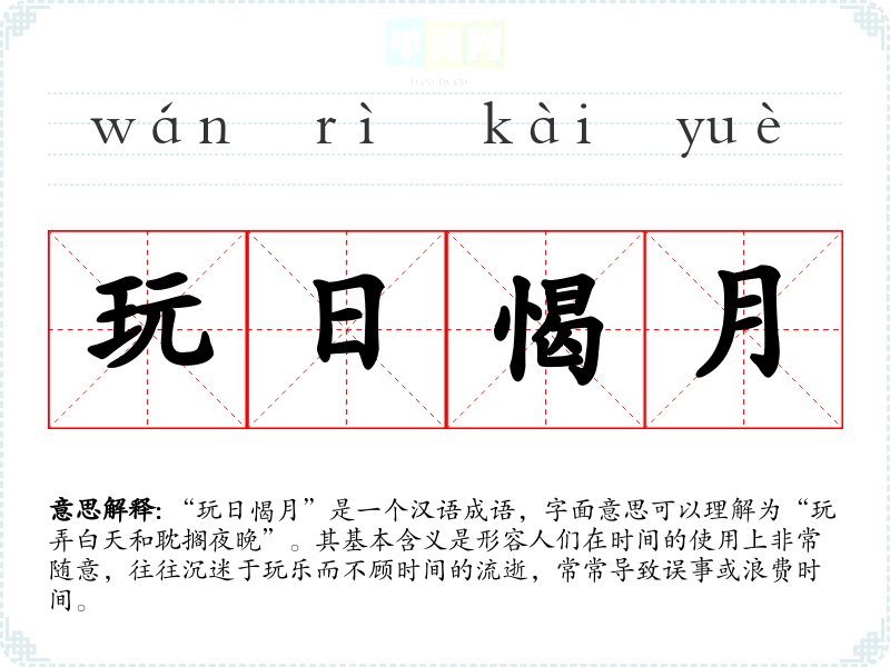 “玩日愒月”是一个汉语成语,字面意思可以理解为“玩弄白天和耽搁夜晚”。其基本含义是形容人们在时间的使用上非常随意,往往沉迷于玩乐而不顾时间的流逝,常常导致误事或浪费时间。