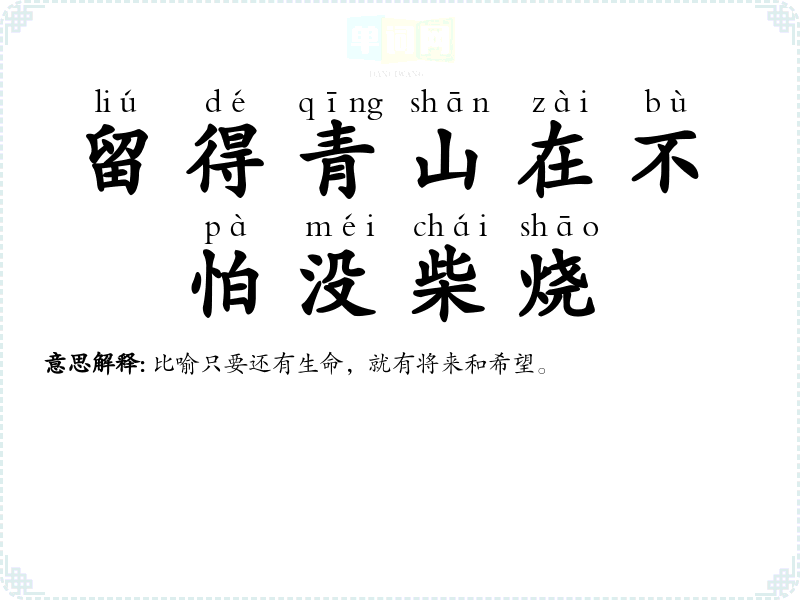留得青山在,不怕没柴烧 比喻只要还有生命,就有将来和希望。