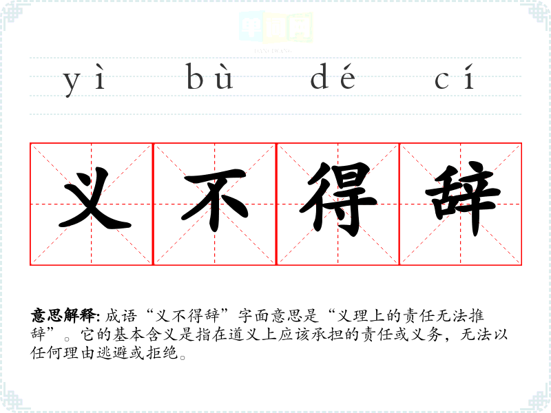 成语“义不得辞”字面意思是“义理上的责任无法推辞”。它的基本含义是指在道义上应该承担的责任或义务,无法以任何理由逃避或拒绝。