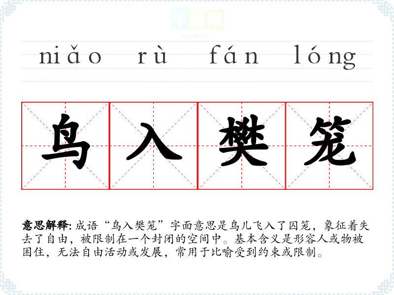 成语“鸟入樊笼”字面意思是鸟儿飞入了囚笼,象征着失去了自由,被限制在一个封闭的空间中。基本含义是形容人或物被困住,无法自由活动或发展,常用于比喻受到约束或限制。