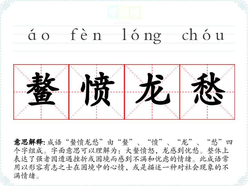 成语“鳌愤龙愁”由“鳌”、“愤”、“龙”、“愁”四个字组成。字面意思可以理解为:大鳌愤怒,龙感到忧愁。整体上表达了强者因遭遇挫折或困境而感到不满和忧虑的情绪。此成语常用以形容有志之士在困境中的心情,或是描述一种对社会现象的不满情绪。