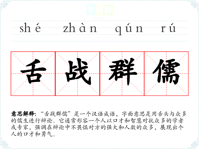 “舌战群儒”是一个汉语成语,字面意思是用舌头与众多的儒生进行辩论。它通常形容一个人以口才和智慧对抗众多的学者或专家,强调在辩论中不畏惧对方的强大和人数的众多,展现出个人的口才和勇气。