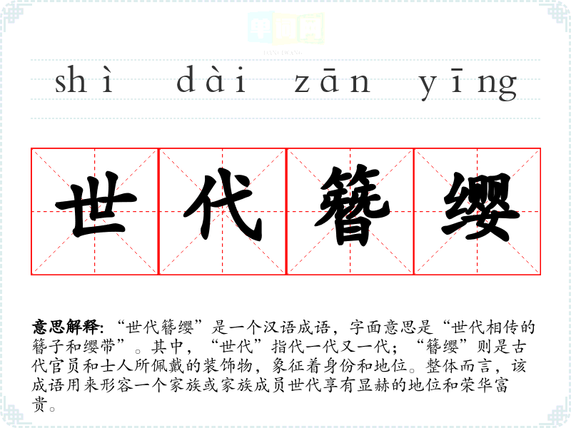 | 世代簪缨 | 簪缨:头簪和束发的缨络,古代达官贵人的冠饰。接连几代都是做高官的的仕宦之家。 |