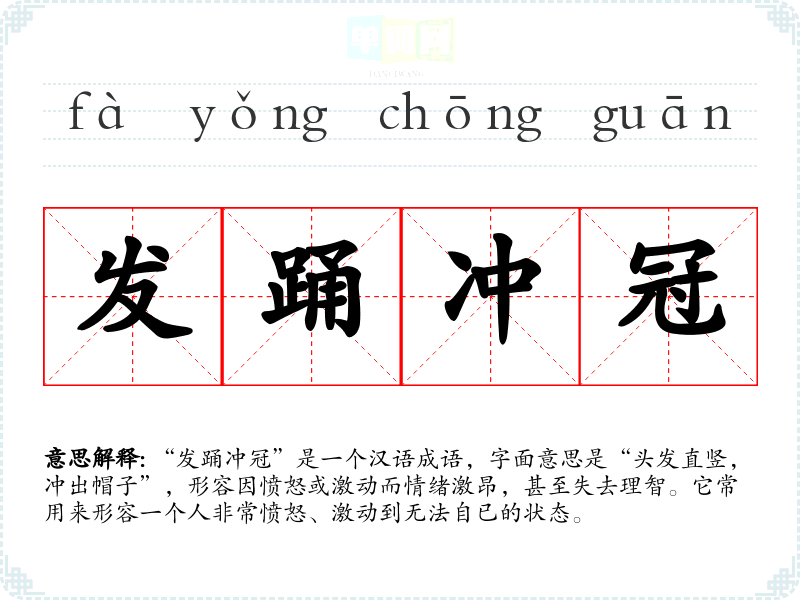 “发踊冲冠”是一个汉语成语,字面意思是“头发直竖,冲出帽子”,形容因愤怒或激动而情绪激昂,甚至失去理智。它常用来形容一个人非常愤怒、激动到无法自已的状态。