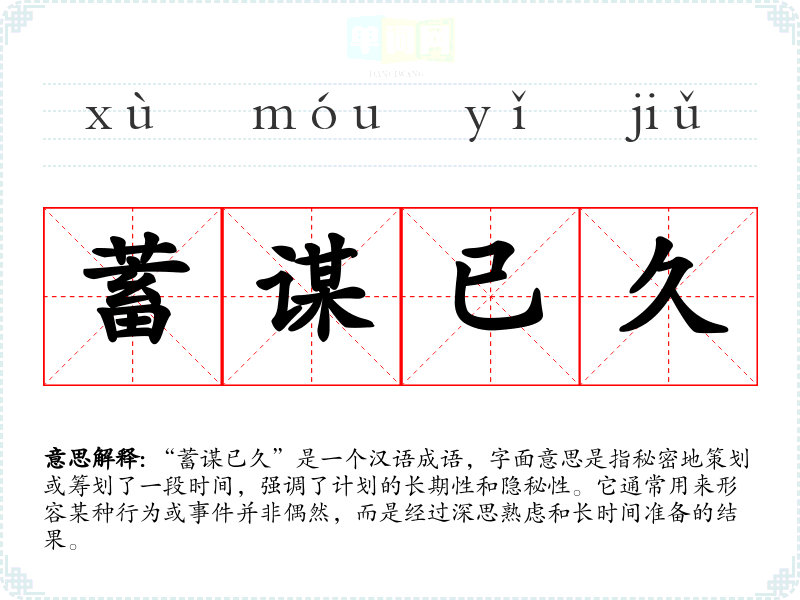 | 蓄谋已久 | 蓄:等待;谋:谋划。对某件事情等待、谋划了很长时间。含贬义。 |