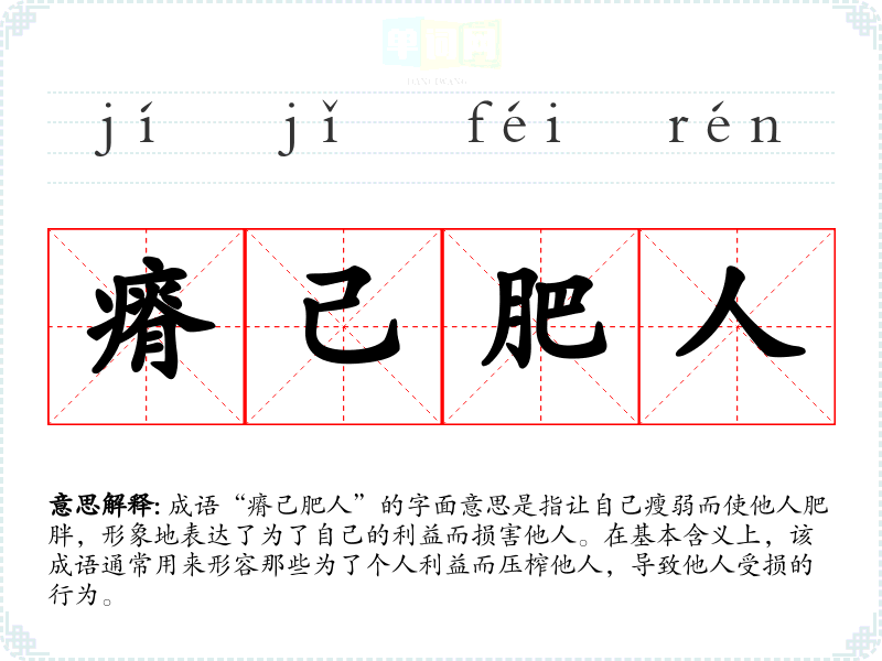 成语“瘠己肥人”的字面意思是指让自己瘦弱而使他人肥胖,形象地表达了为了自己的利益而损害他人。在基本含义上,该成语通常用来形容那些为了个人利益而压榨他人,导致他人受损的行为。