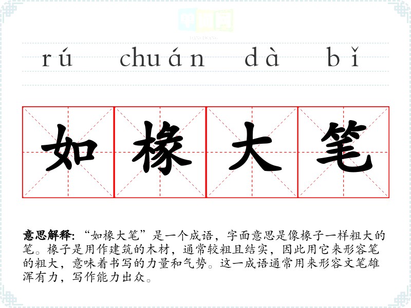 “如椽大笔”是一个成语,字面意思是像椽子一样粗大的笔。椽子是用作建筑的木材,通常较粗且结实,因此用它来形容笔的粗大,意味着书写的力量和气势。这一成语通常用来形容文笔雄浑有力,写作能力出众。