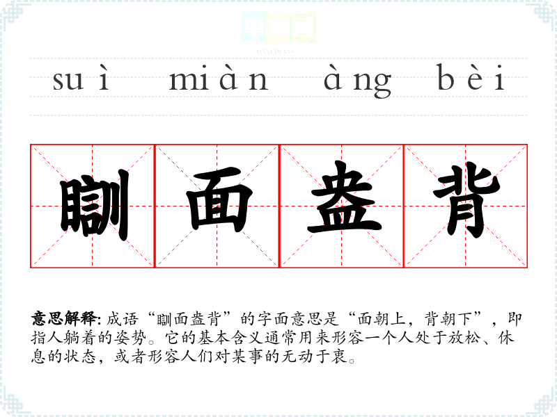 成语“瞓面盎背”的字面意思是“面朝上,背朝下”,即指人躺着的姿势。它的基本含义通常用来形容一个人处于放松、休息的状态,或者形容人们对某事的无动于衷。