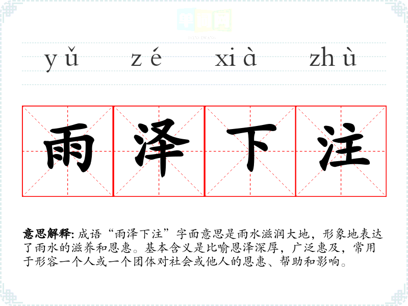 成语“雨泽下注”字面意思是雨水滋润大地,形象地表达了雨水的滋养和恩惠。基本含义是比喻恩泽深厚,广泛惠及,常用于形容一个人或一个团体对社会或他人的恩惠、帮助和影响。
