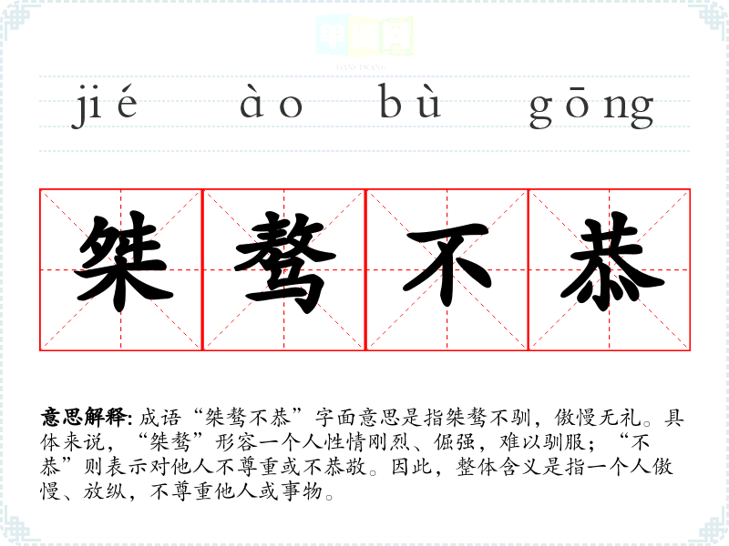 | 桀骜不恭 | 凶悍倔强,傲慢不顺从。同“桀骜不逊”。 |