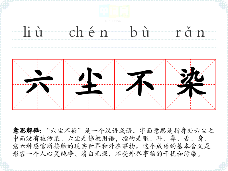 | 六尘不染 | 佛教语,六尘:指色、声、香、味、触、法。指排除物欲,保持心地洁净。 |