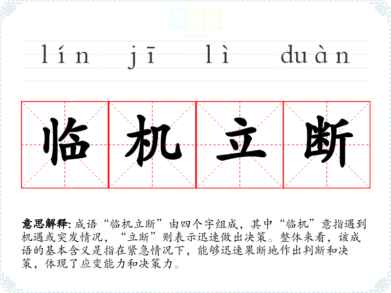成语“临机立断”由四个字组成,其中“临机”意指遇到机遇或突发情况,“立断”则表示迅速做出决策。整体来看,该成语的基本含义是指在紧急情况下,能够迅速果断地作出判断和决策,体现了应变能力和决策力。