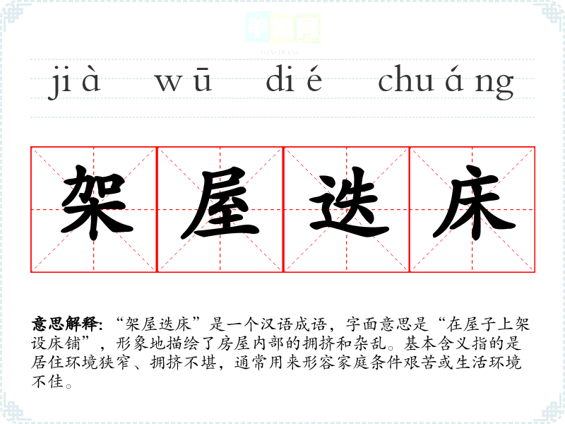 “架屋迭床”是一个汉语成语,字面意思是“在屋子上架设床铺”,形象地描绘了房屋内部的拥挤和杂乱。基本含义指的是居住环境狭窄、拥挤不堪,通常用来形容家庭条件艰苦或生活环境不佳。