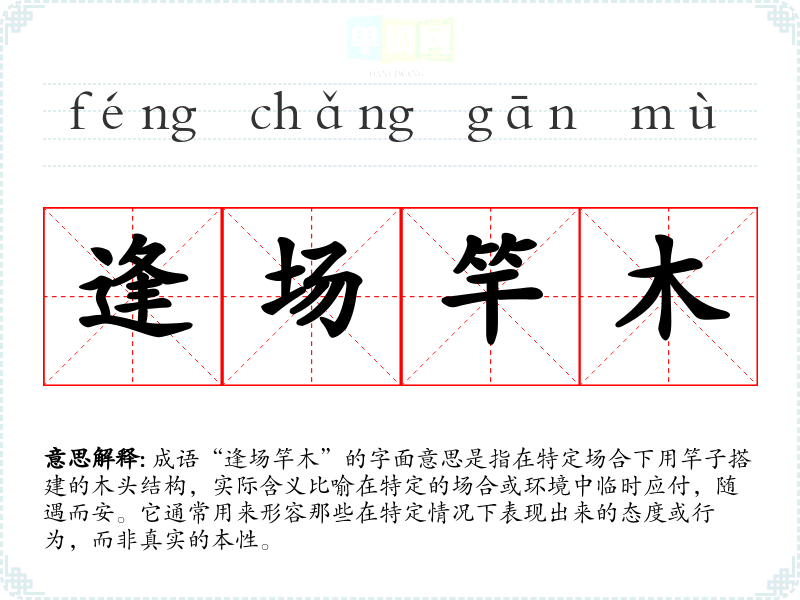 成语“逢场竿木”的字面意思是指在特定场合下用竿子搭建的木头结构,实际含义比喻在特定的场合或环境中临时应付,随遇而安。它通常用来形容那些在特定情况下表现出来的态度或行为,而非真实的本性。