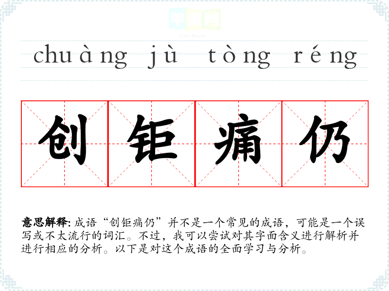 成语“创钜痛仍”并不是一个常见的成语,可能是一个误写或不太流行的词汇。不过,我可以尝试对其字面含义进行解析并进行相应的分析。以下是对这个成语的全面学习与分析。
