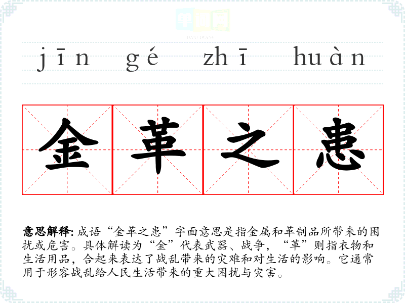 “金革之患”出自《左传》。在春秋时期,诸侯之间频繁发生战争,百姓苦不堪言。历史上,战乱不仅影响了国家的安定,也对人们的生活造成了极大的困扰。因此,这个成语反映了对战争的忧虑和对和平生活的渴望。