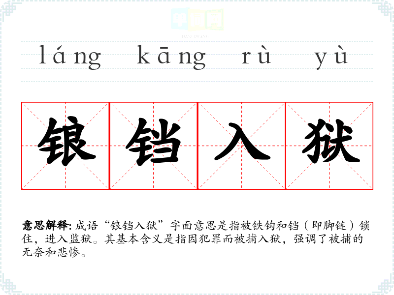 成语“锒铛入狱”字面意思是指被铁钩和铛(即脚链)锁住,进入监狱。其基本含义是指因犯罪而被捕入狱,强调了被捕的无奈和悲惨。