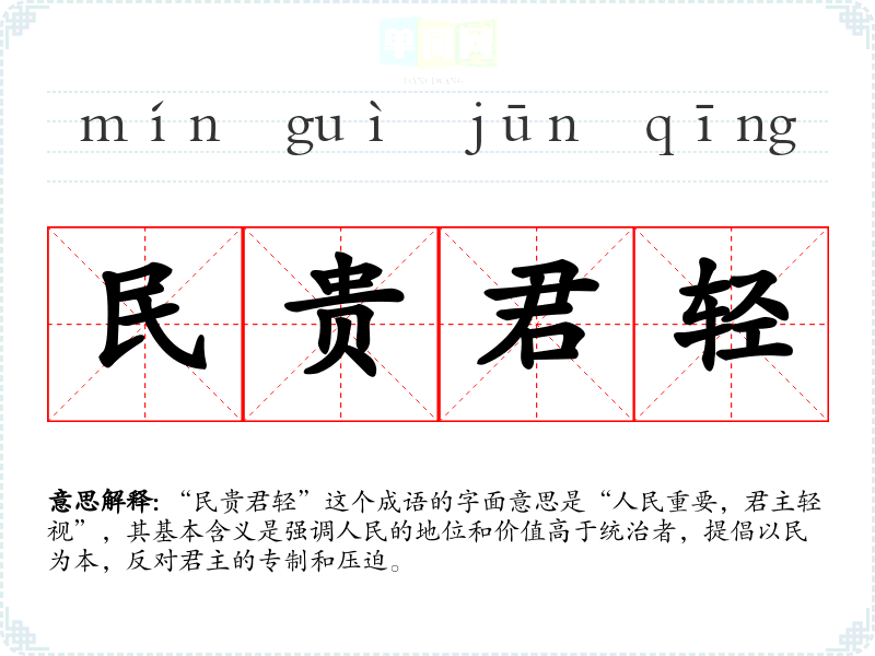 “民贵君轻”这个成语的字面意思是“人民重要,君主轻视”,其基本含义是强调人民的地位和价值高于统治者,提倡以民为本,反对君主的专制和压迫。