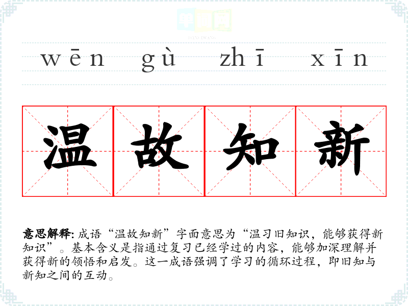 成语“温故知新”字面意思为“温旧知识,能够获得新知识”。基本含义是指通过复已经学过的内容,能够加深理解并获得新的领悟和启发。这一成语强调了学*的循环过程,即旧知与新知之间的互动。
