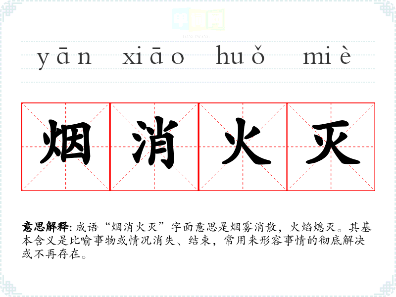成语“烟消火灭”字面意思是烟雾消散,火焰熄灭。其基本含义是比喻事物或情况消失、结束,常用来形容事情的彻底解决或不再存在。