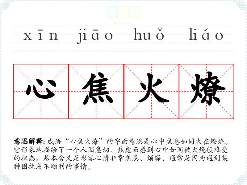 “心焦火燎”这个成语的来源并不十分明确,但它可能与古代文学作品中的描写有关。在古代,火象征着急迫和强烈的情感,而心焦则是指内心的烦躁和不安。这种表达方式常见于古汉语的修辞中,强调心理状态的强烈。例如,古人常用火来比喻内心的焦虑和不安。