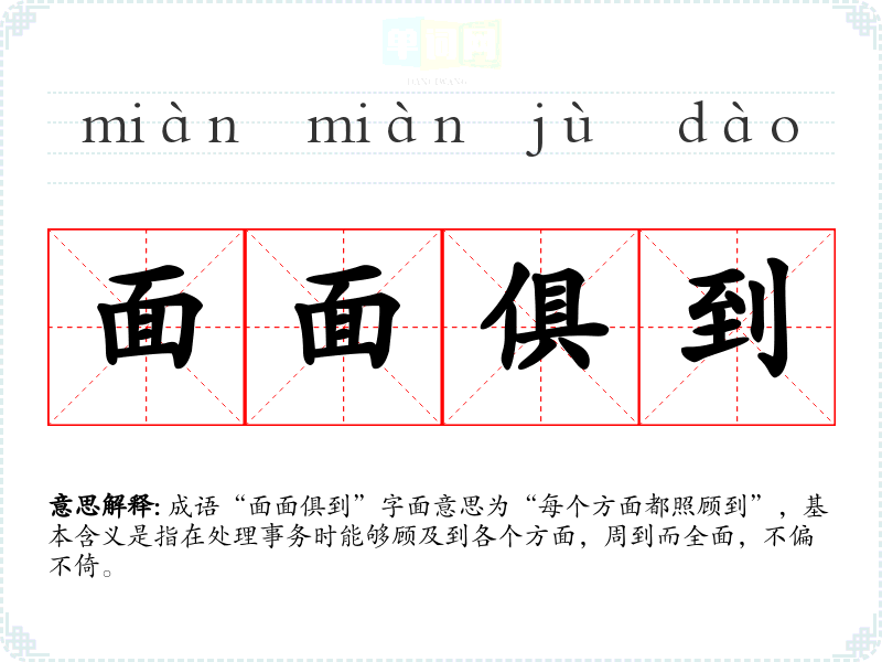 成语“面面俱到”字面意思为“每个方面都照顾到”,基本含义是指在处理事务时能够顾及到各个方面,周到而全面,不偏不倚。