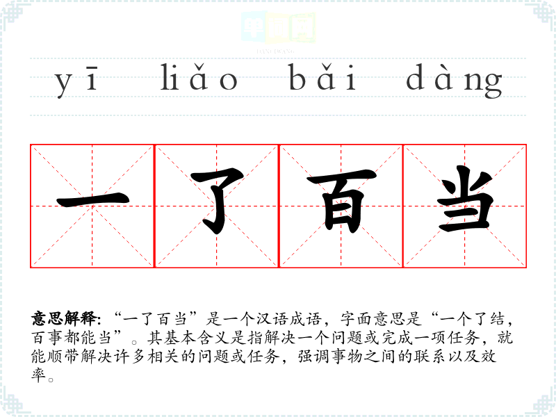“一了百当”是一个汉语成语,字面意思是“一个了结,百事都能当”。其基本含义是指解决一个问题或完成一项任务,就能顺带解决许多相关的问题或任务,强调事物之间的联系以及效率。
