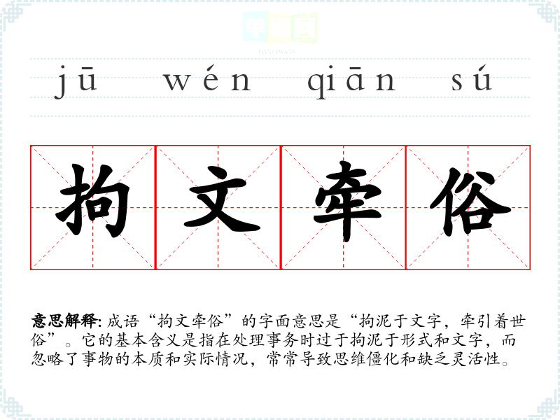成语“拘文牵俗”的字面意思是“拘泥于文字,牵引着世俗”。它的基本含义是指在处理事务时过于拘泥于形式和文字,而忽略了事物的本质和实际情况,常常导致思维僵化和缺乏灵活性。