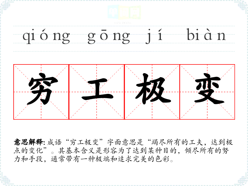 成语“穷工极变”字面意思是“竭尽所有的工夫,达到极点的变化”。其基本含义是形容为了达到某种目的,倾尽所有的努力和手段,通常带有一种极端和追求完美的色彩。