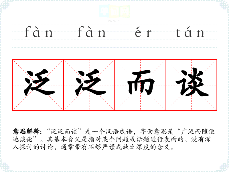 “泛泛而谈”是一个汉语成语,字面意思是“广泛而随便地谈论”。其基本含义是指对某个问题或话题进行表面的、没有深入探讨的讨论,通常带有不够严谨或缺乏深度的含义。