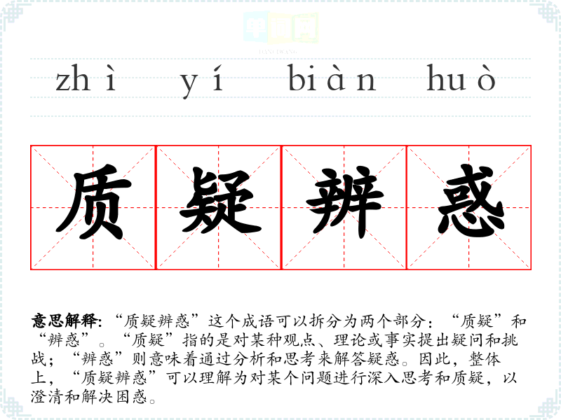 “质疑辨惑”这个成语可以拆分为两个部分:“质疑”和“辨惑”。“质疑”指的是对某种观点、理论或事实提出疑问和挑战;“辨惑”则意味着通过分析和思考来解答疑惑。因此,整体上,“质疑辨惑”可以理解为对某个问题进行深入思考和质疑,以澄清和解决困惑。