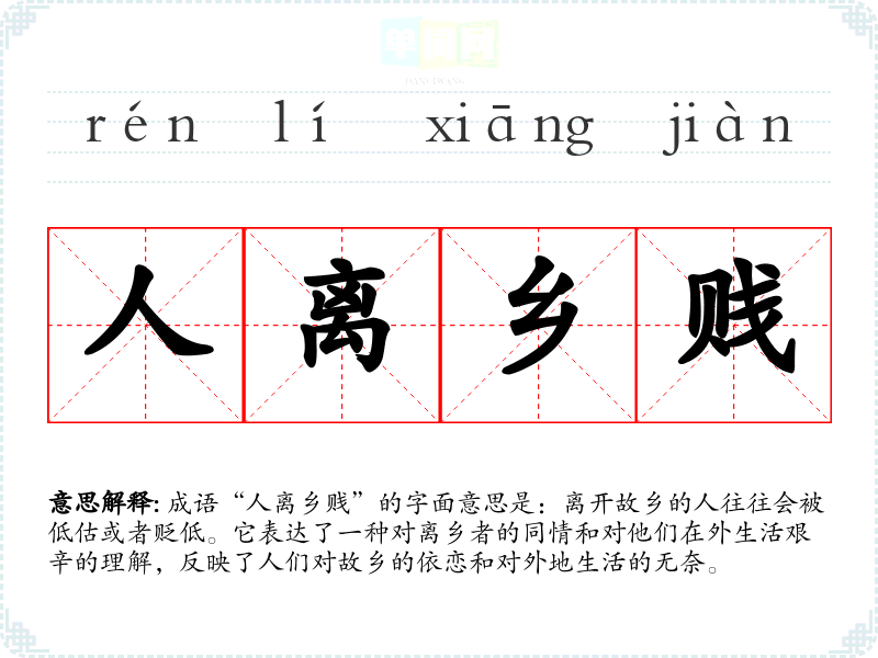 成语“人离乡贱”的字面意思是:离开故乡的人往往会被低估或者贬低。它表达了一种对离乡者的同情和对他们在外生活艰辛的理解,反映了人们对故乡的依恋和对外地生活的无奈。