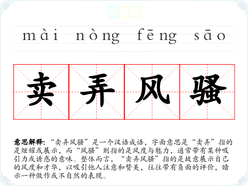“卖弄风骚”是一个汉语成语,字面意思是“卖弄”指的是炫耀或展示,而“风骚”则指的是风度与魅力,通常带有某种吸引力或诱惑的意味。整体而言,“卖弄风骚”指的是故意展示自己的风度和才华,以吸引他人注意和赞美,往往带有负面的评价,暗示一种做作或不自然的表现。