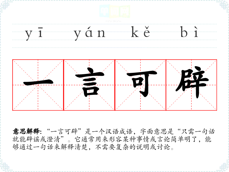 “一言可辟”是一个汉语成语,字面意思是“只需一句话就能辟谣或澄清”。它通常用来形容某种事情或言论简单明了,能够通过一句话来解释清楚,不需要复杂的说明或讨论。