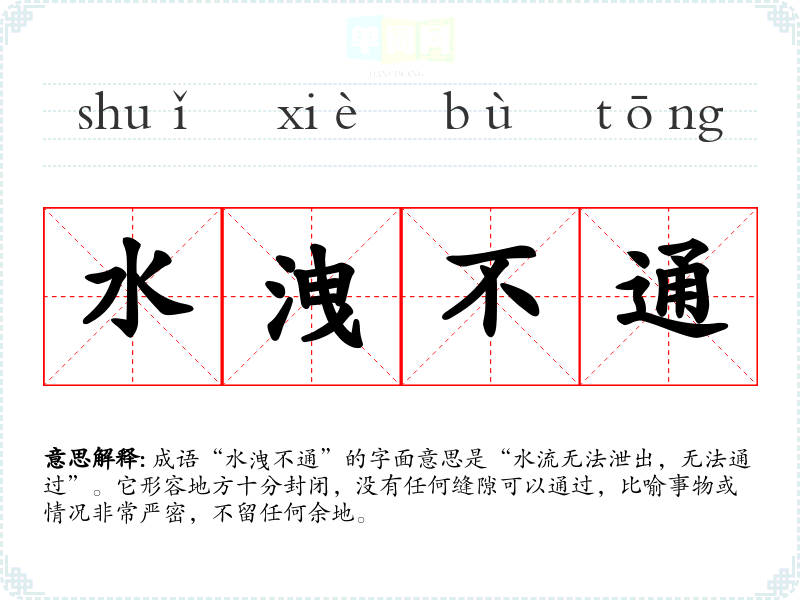 成语“水洩不通”的字面意思是“水流无法泄出,无法通过”。它形容地方十分封闭,没有任何缝隙可以通过,比喻事物或情况非常严密,不留任何余地。