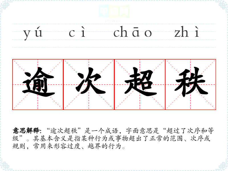 “逾次超秩”是一个成语,字面意思是“超过了次序和等级”。其基本含义是指某种行为或事物超出了正常的范围、次序或规则,常用来形容过度、越界的行为。
