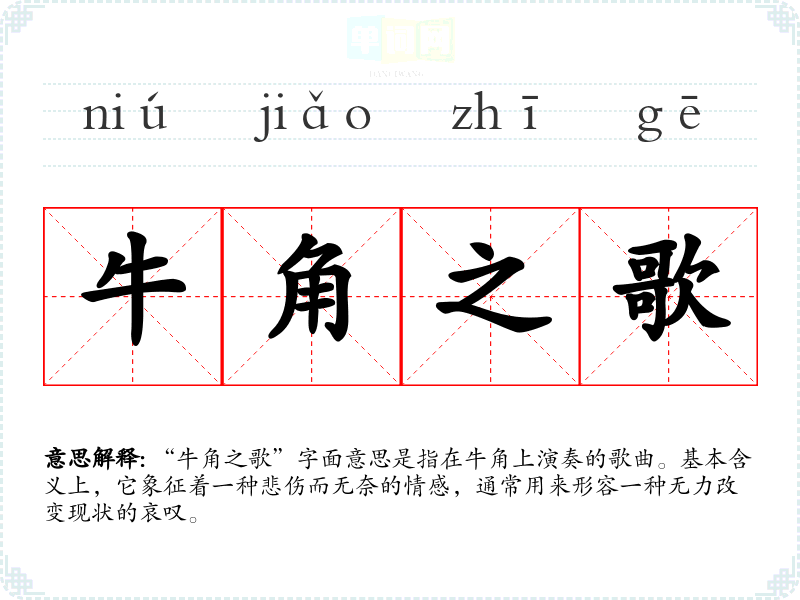 “牛角之歌”字面意思是指在牛角上演奏的歌曲。基本含义上,它象征着一种悲伤而无奈的情感,通常用来形容一种无力改变现状的哀叹。
