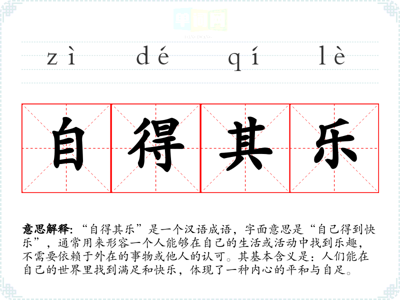 “自得其乐”是一个汉语成语,字面意思是“自己得到快乐”,通常用来形容一个人能够在自己的生活或活动中找到乐趣,不需要依赖于外在的事物或他人的认可。其基本含义是:人们能在自己的世界里找到满足和快乐,体现了一种内心的平和与自足。