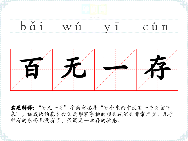 “百无一存”字面意思是“百个东西中没有一个存留下来”。该成语的基本含义是形容事物的损失或消失非常严重,几乎所有的东西都没有了,强调无一幸存的状态。